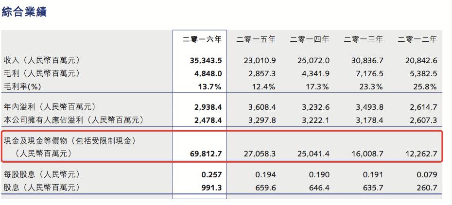 在融创中国2016年财报中发现,截至2016年,融创中国手中的现金及现金等价物总额为698.12亿元,其中非受限制现金为520.86亿元。值得注意的是,截至2015年年末,融创中国手上的现金仅有270.58亿元。