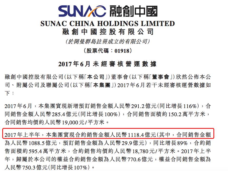 而融创中国2017年6月发布的业绩简报显示,今年上半年,融创的销售金额已经达到了1118.4亿元,比去年同期增长了89%。