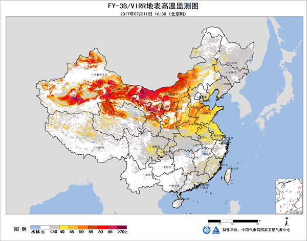 阳光暴晒下,西北地区局部地表温度超过60℃。据国家卫星气象中心昨天16时30分监测显示:新疆中部和东部、内蒙古中西部、宁夏大部、山西中南部、陕西北部、河北南部、山东西北部、河南北部、天津南部局部地区地表温度超过50℃;新疆中部和东部局部、甘肃局部、青海西北部局部、内蒙古西部、宁夏中部和北部地表温度超过60℃。