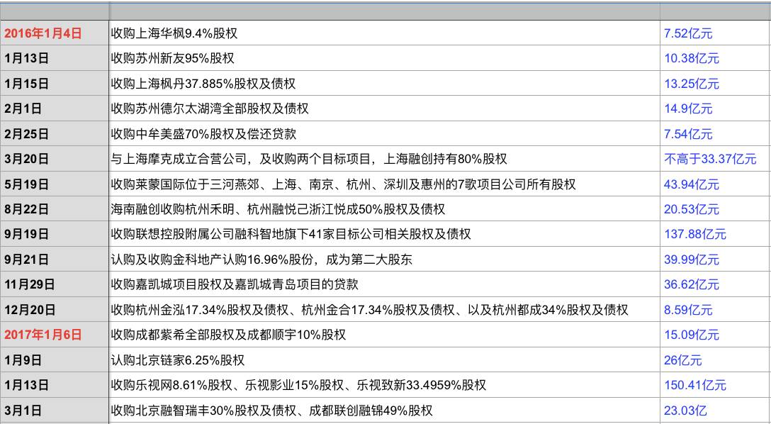 在融创中国2016年财报中发现,从去年到今年3月,融创完成了16笔并购,斥资约589亿元。
