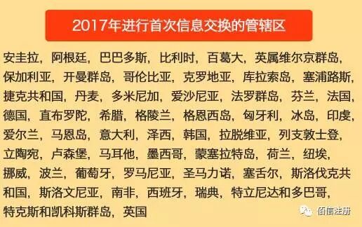 2017年进行首次信息交换的管辖区包括:阿根廷,塞浦路斯,爱尔兰,意大利,韩国,马耳他,葡萄牙,西班牙,英国。2018年后中国也逃脱不了CRS的魔掌。
