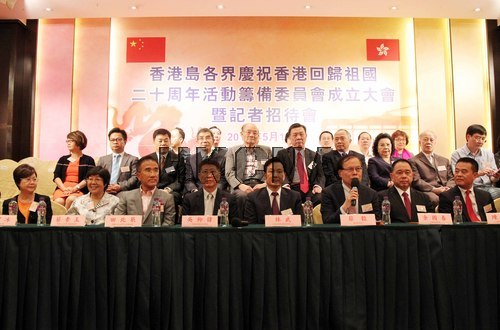 5月16日,“香港岛各界庆祝香港回归祖国20週年活动筹备委员会”举行记者会,中央政府驻港联络办副主任林武(右四)、筹委会主席蔡毅(右三)等嘉宾出席。“香港岛各界庆祝香港回归祖国20週年活动筹备委员会”將统筹港岛区一系列庆祝活动,包括大型音乐匯演、文艺晚会、单车巡游、舞火龙等。